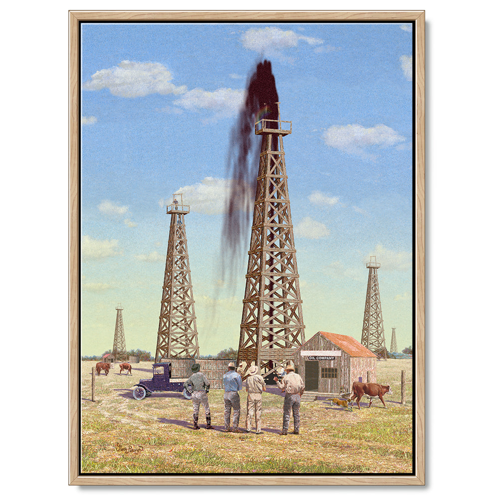 Roaring In Of #2 is one the canvas prints made from one my original oil paintings, acrylic paintings, or illustrations. We utilize the giclee printing reproduction process to create our art home decor. They are signed and numbered and limited editions of 950. Our art prints are made in America in our art studio in Corpus Christi, Texas. I can personalize this print by hand-lettering any name up to 16 characters on the white sign on the building. This scene depicts the change from cattle to oil in early 1900's Texas.